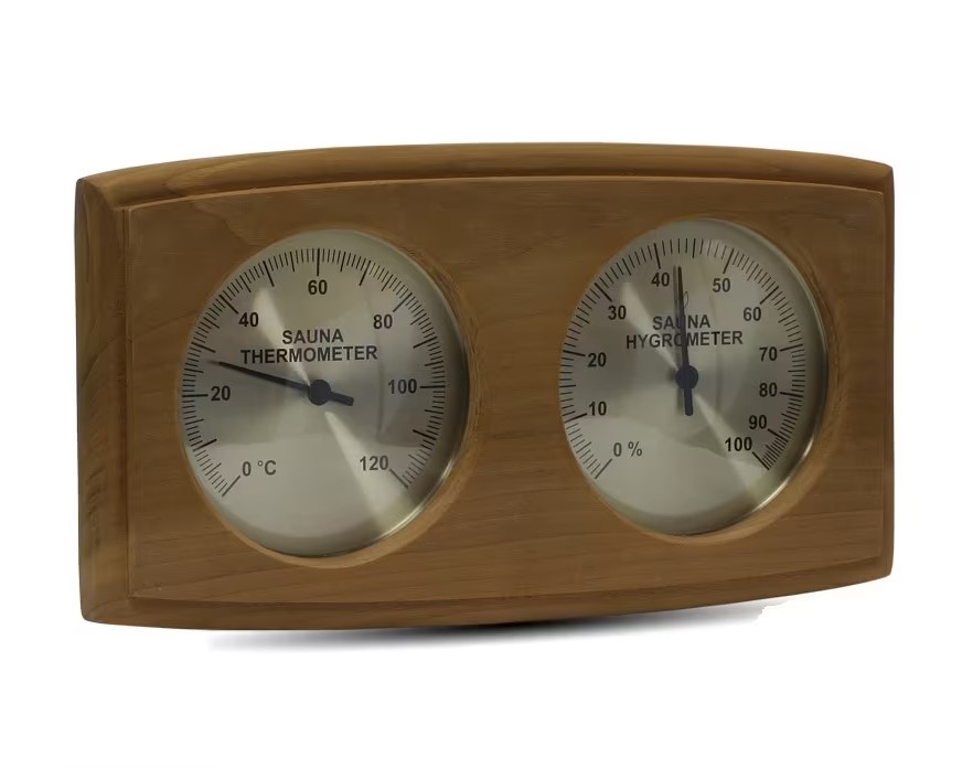 Термогигрометр 271-THBD от компании Sawo имеет классическую прямоугольную форму со скруглёнными углами. В широкой рамке из древесины кедра находится два круглых окошка. Под стеклом каждого окошка расположен графичный циферблат.Один из них - это гигрометр, который с точностью измерит уровень влажности в парной, другой - термометр, который сообщит о температуре воздуха. Данный прибор прекрасно подойдёт для использования в любом парильном помещении.
