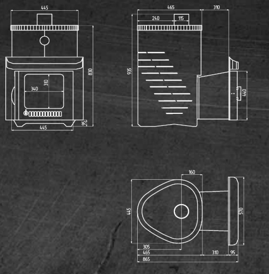 Закладка дров производится из смежного помещения. Максимальная длина поленьев — 300 мм, максимальный вес дров — 7 кг. Дверца снабжена большим стеклом, что создает эффект камина. Для регулировки горения установлен один воздухозаборник. Печь оснащена системами «чистое стекло» и VORTEX. Есть возможность установить парогенерирующие кассеты.