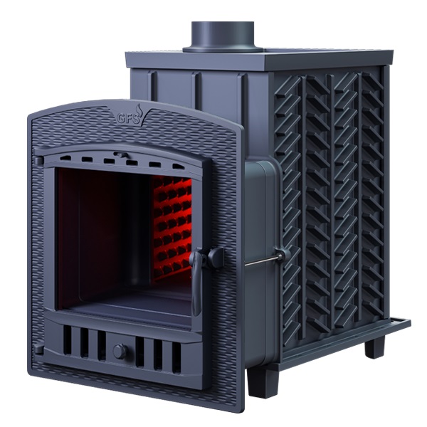 GFS-ЗК - печь с усиленной каменкой большей массы, с единым углублением внутрь топки для дополнительной укладки чугунного заряда. Теплосъемные шипы, со стороны горения пламени, в разы увеличивают площадь соприкосновения огня с каменкой и ускоряют передачу тепла, а также способствуют лучшему дожигу смешивая потоки пламени и воздуха поступаемого из воздушника. Эти усовершенствования значительно повышают мощность парообразования печи и выдают большее количество пара при непрерывной подаче воды. Каменка печей GFS-ЗК является незаливаемой.