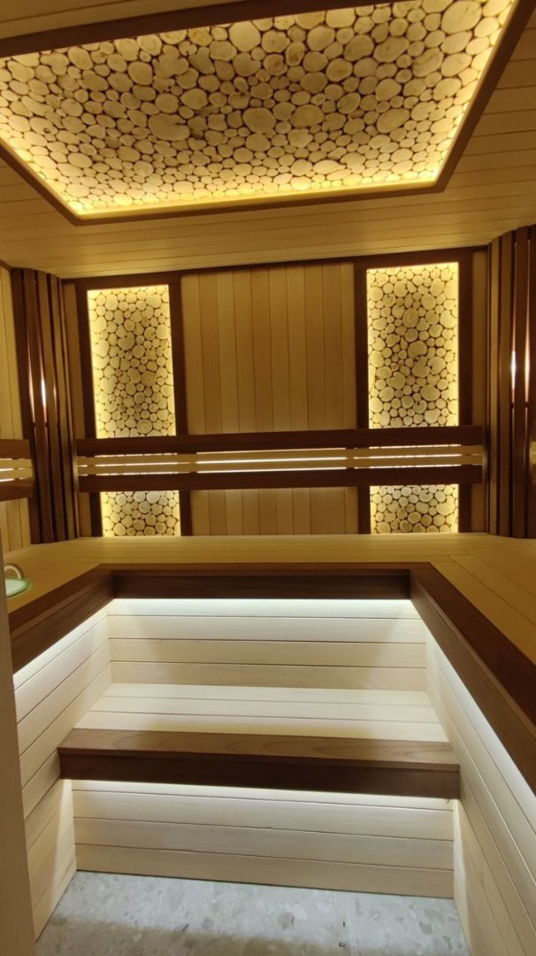 Изначально заказчик хотел парную из ольхи, но в итоге в проекте реализовано интересное дизайнерское решение – сочетание разных древесных текстур: липы, абаша и можжевельника.