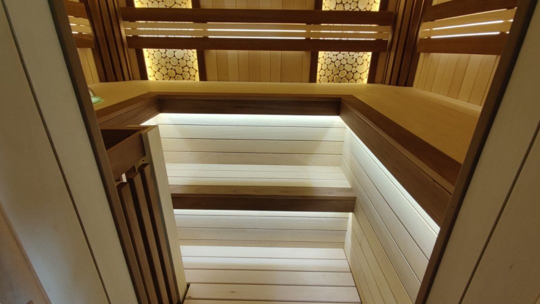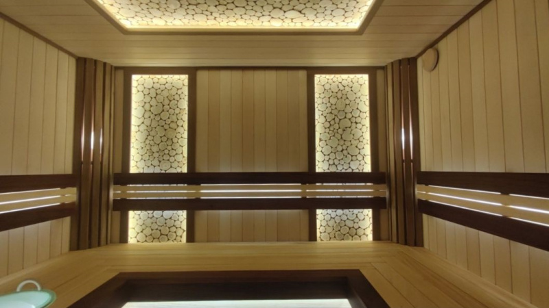 По обеим сторонам парной расположены светильники Harvia, скрытые за узкими вертикальными полками из термолипы. Стены обшиты гладкой липовой вагонкой модели “Хай-Тек” в вертикальном расположении.