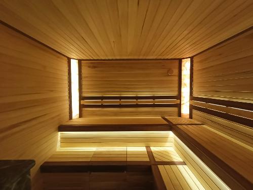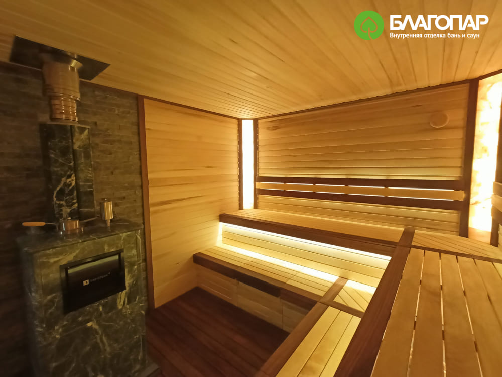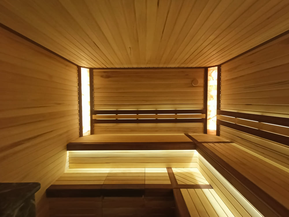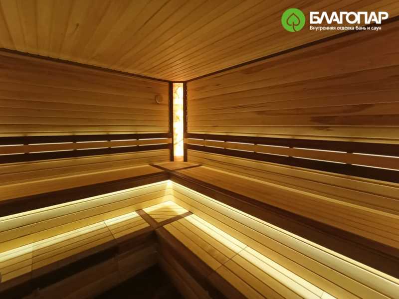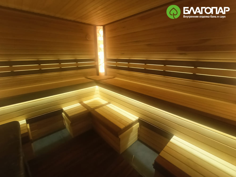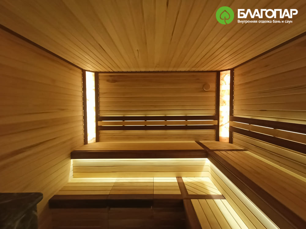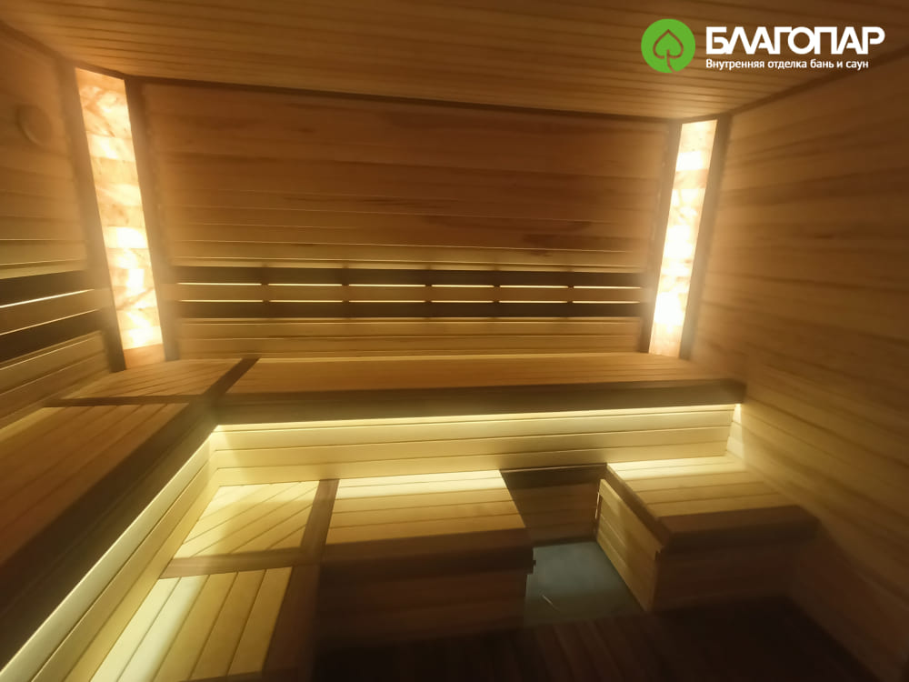 Расположение освещения за полками и подспинниками, а также подсветка соляного панно создают мягкую и расслабляющую атмосферу в парной, способствуя дополнительной релаксации.
