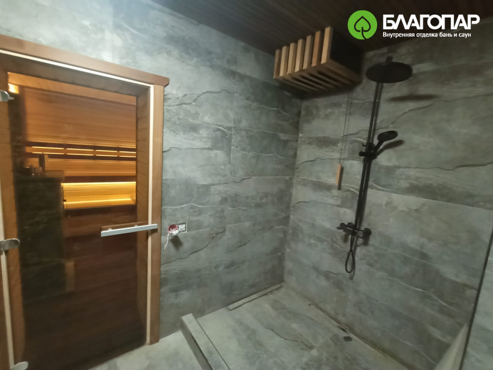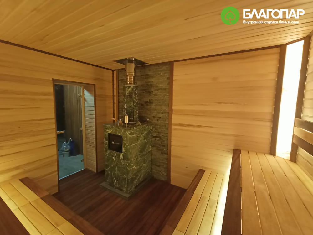 Баня отапливается дровяной печью Изистим. Печь на дровах – это традиционный выбор для обогрева парных, а облицовка из змеевика придает ей элегантный внешний вид и останавливает жёсткое ИК излучение. Стена за печью обшита другим популярным в отделке бань натуральным камнем – талькохлоритом.