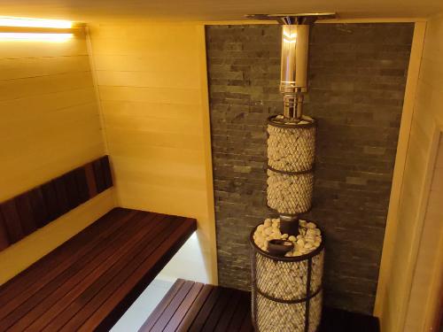 Для обогрева парной установлена классическая печь на дровах «Атмосфера». Кожух печи изготовлен в виде сетки из стали и полностью заполняется природным камням, обеспечивая высокую динамику нагрева парильного помещения.