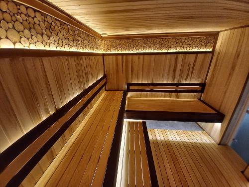 Полки и подспинники выполнены из липы в сочетании с термолипой. Такое сочетание гармонирует с другими натуральными материалами, использованными в отделке, а также является практичным и стильным решением за счет прочности и долговечности липовой древесины.