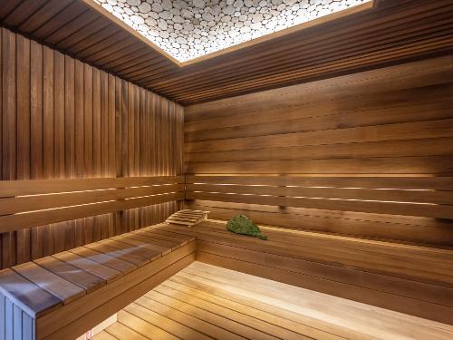 Освещение в сауне реализовано в виде подсветки можжевелового панно на потолке. Этот немного приглушенный свет создает уютную и расслабляющую атмосферу, идеальную для отдыха и релаксации. Комбинация всех этих элементов делает интерьер не только функциональным, но и уютным, что особенно важно в сауне, куда люди приходят отдыхать и расслабляться.
