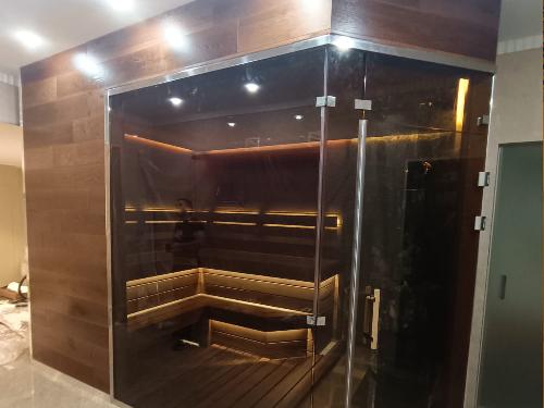 Стены, пол и потолок обшиты вагонкой из термообработанной липовой древисины. Угловые полки также выполнены из термолипы и имеют два уровня. Для бОльшего удобства и экономии пространства нижний уровень выдвижной.