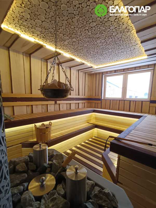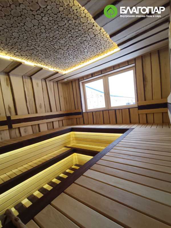 Остановимся более подробно на внутренней отделке парной. Стены и потолок обшиты необрезной липовой доской. Этот материал, благодаря своим природным текстурам, создает аутентичную атмосферу тепла и уюта в интерьере.