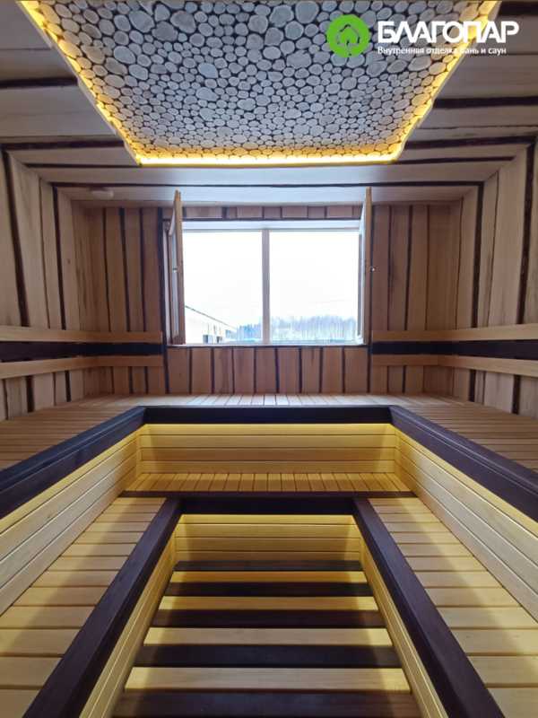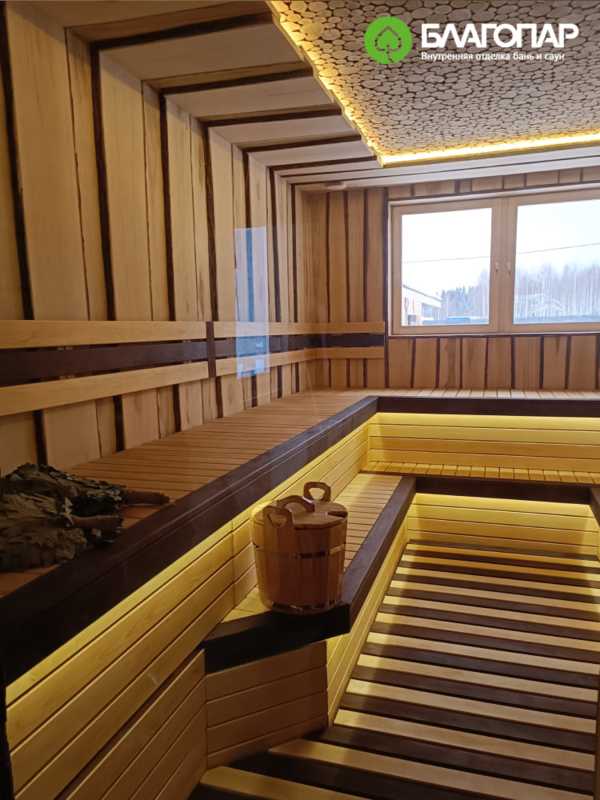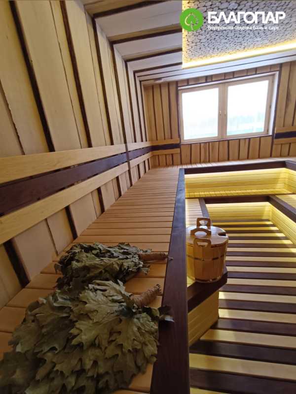 Двухуровневые П-образные полки позволяют не только комфортно расположиться большой компанией, но и удобно разместить бондарные изделия. Полки выполнены из липы сорта А/Э, эффектный акцент добавляет термолипа, использованная для окантовки сидений. В отделке пола и подспинников также используется сочетание этих двух сортов липой древесины.