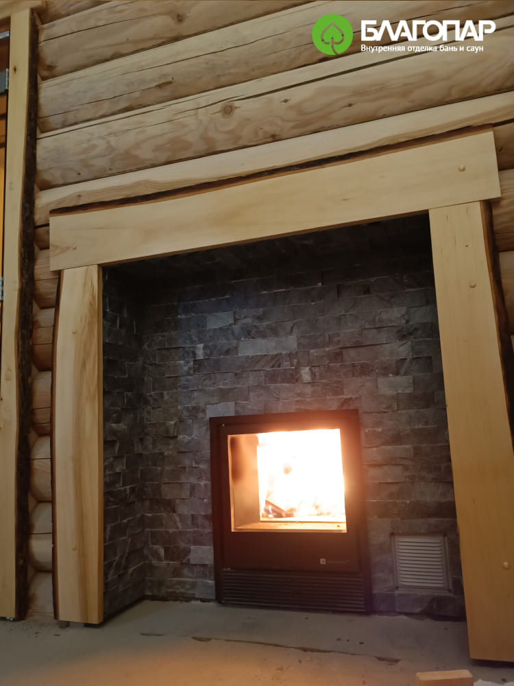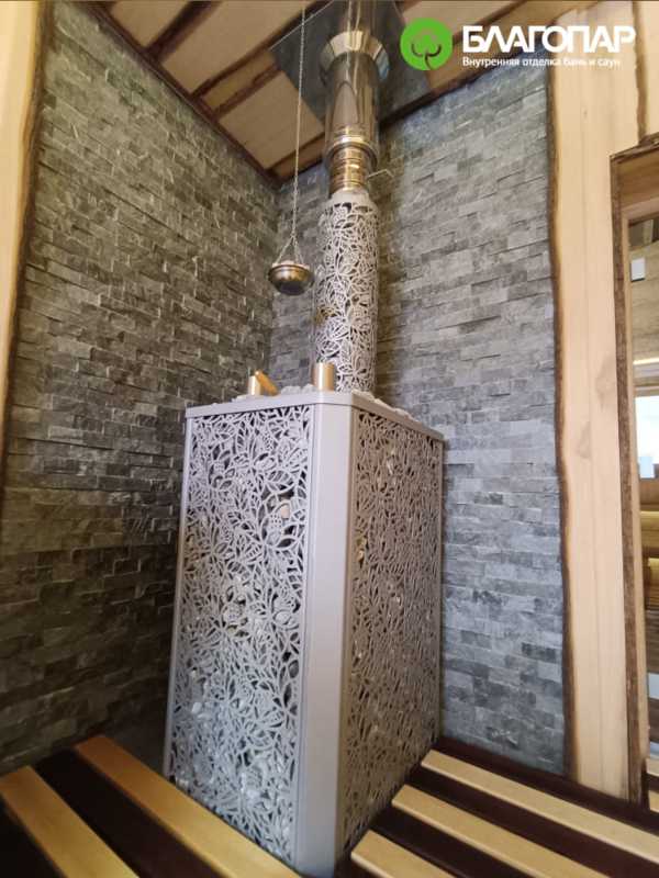 Стена за печью облицована плиткой из талькохлорита. Естественная текстура камня и рваная поверхность плитки придают интерьеру парной дополнительный природный шарм.