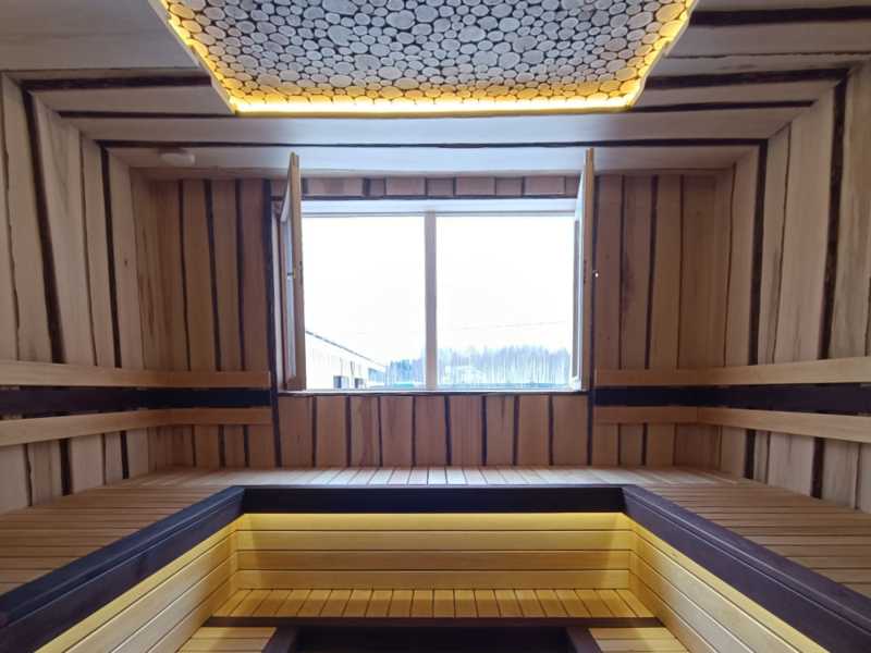 Подсветка установлена под полками и по периметру можжевелового панно на потолке. Большие окна пропускают естественный свет и позволяют наслаждаться природными видами во время парения.