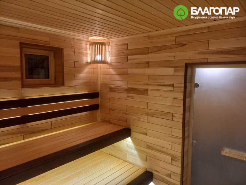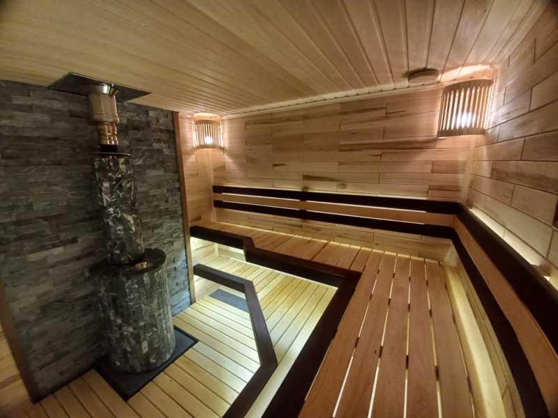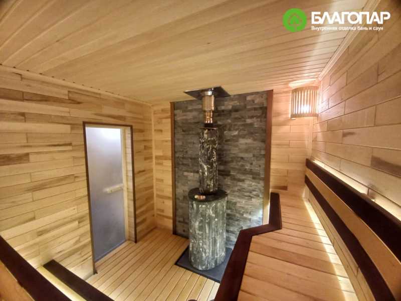 Стены парной обшиты паркеткой из текстурированной липы. Её натуральный оттенок и узоры создают уютную и тёплую атмосферу, добавляя интерьеру изысканность и природную привлекательность.