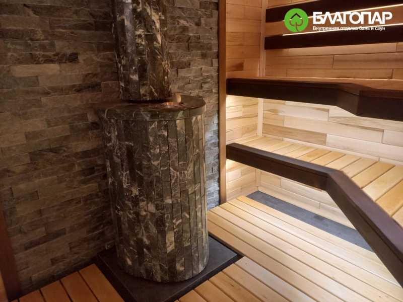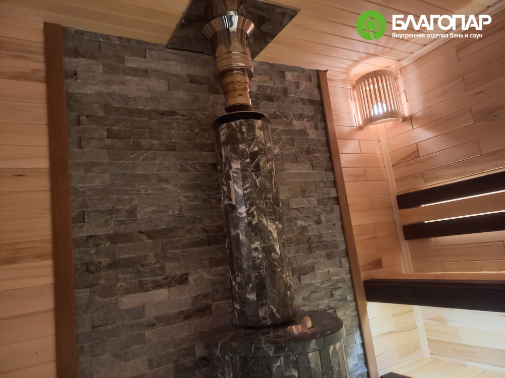 Для обогрева помещения установлена дровяная печь «Ферингер», которая создаёт лёгкий и жаркий, расслабляющий и оздоравливающий пар. Печь облицована наборными ламелями из змеевика. Змеевик останавливает жёсткое ИК излучение, а высокая теплопроводность камня позволяет эффективно распределять тепло внутри парной.
