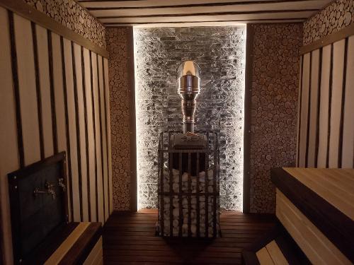 Можжевеловое панно на стенах будет радовать посетителей сауны своим приятным ароматом. А панно из гималайской соли, кроме декоративных функций, служит еще и элементом освещения.