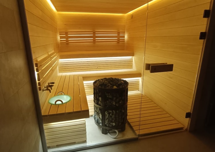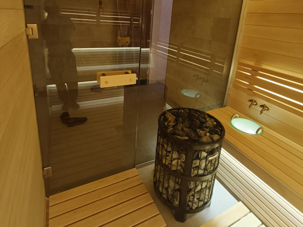 Полки выполнены из липы сорта А/Э. Стильный акцент в интерьер сауны добавляет встроенная в полок шайка Cariitti со светодиодной подсветкой.