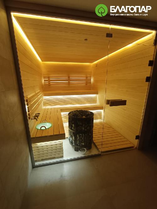 Изюминка этой сауны – дверь и стена из закаленного стекла, которое создает ощущение простора, что особенно актуально для парной небольшого размера. Закаленное стекло выдерживает высокие температурные и механические нагрузки, это экономичный и простой в уходе материал, который набирает всё большую популярность в отделке бань и саун. Кроме того, стеклянная перегородка в бане обеспечивает максимальную безопасность: если вдруг кому-то стало плохо в парилке, это можно быстро заметить и вовремя среагировать.
